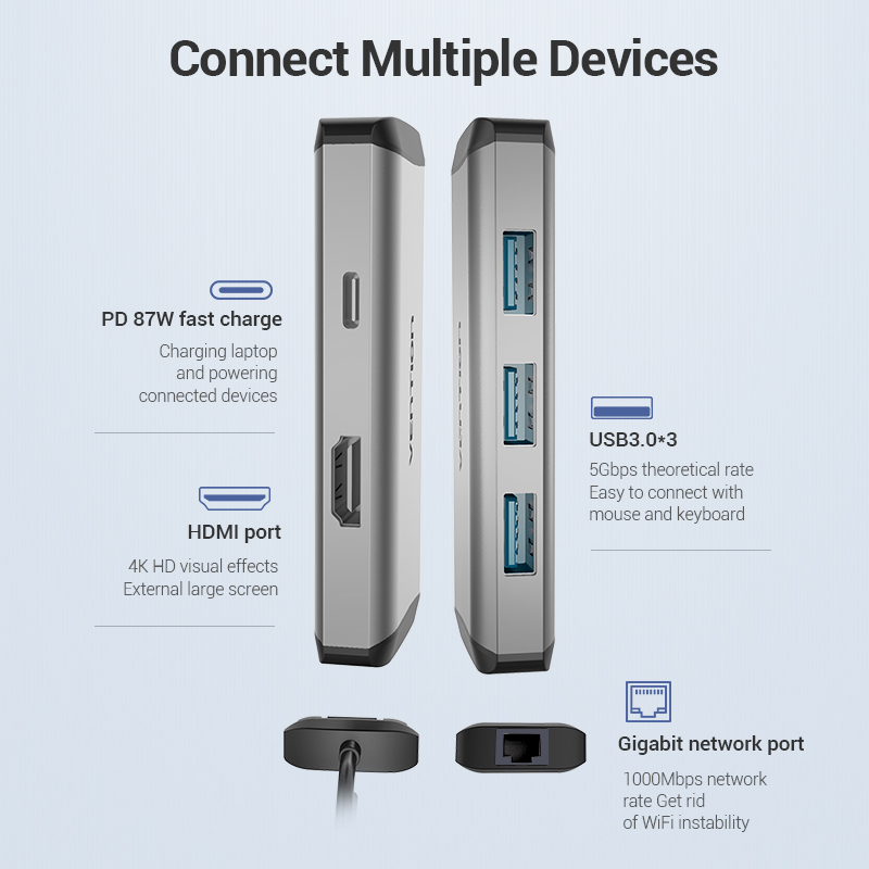 Giới thiệu HUB chuyển đổi USB type-C 6 in 1 Vention sang HDMI, USB 3.0*3, Lan, PD(87) dài 15cm - Hàng chính hãng