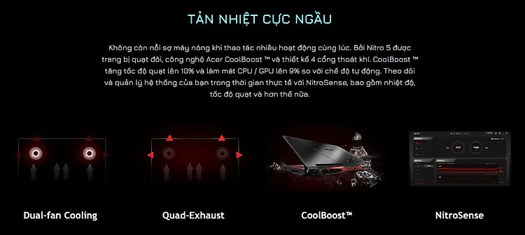 Nitro 5 AN515 74NU có hệ thống tản nhiệt trang bị công nghệ quạt kép 2 quạt kích thước lớn, cùng 3 ống đồng tản nhiệt, được sơn cách nhiệt cùng nhiều khe thoát gió hứa hẹn mang lại khả năng tản nhiệt cực kỳ tốt. Công nghệ CoolBoost giúp tăng quạt lên 10% với khả năng làm mát có thể tùy chỉnh nhanh chóng 3 chế độ quạt bằng Nitro Sense. Với trải nghiệm thực tế phòng máy lạnh 27 độ C, chơi game liên tục 2 tiếng thì nhiệt độ CPU cao nhất chỉ khoảng 80 độ, GPU cũng khá mát mẻ với nhiệt độ tầm 66 độ C. Nhiệt độ tỏa ra bên ngoài như bàn phím chỗ để tay đều khá mát mẻ, các hốc tản nhiệt có nhiệt độ tầm 40 độ C.