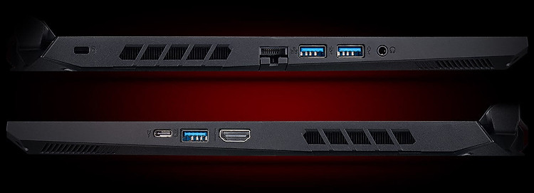 Về các cổng kết nối thì Nitro 5 AN515 57 cũng không có gì thay đổi, vẫn được trang bị đầy đủ các cổng kết nối quen thuộc như HDMI, 1 cổng USB Type-C (ThunderBolt 4 / DisplayPort), 3 cổng USB 3.0, một cổng MicroSD Reader, 1 LAN RJ45, 1 Webcam HD 720p, 1 Jack Audio 3.5mm, 1 Jack Power, cổng mạng, tai nghe, được phân bổ đều ra 2 cạnh bên trái phải của máy, riêng cổng sạc thì nằm ở mặt sau, 1 trong 3 cổng Usb sẽ có hỗ trợ sạc các thiết bị bên ngoài ngay cả khi máy bạn đã tắt, các cổng kết nối giúp máy vừa truyền tải dữ liệu tốc độ cao, vừa có chức năng sạc nhanh 5V 3A, nhưng cổng HDMI và usb type c có vị trí gây đôi chút vướng víu khi sử dụng cùng lúc cắm ổ cứng rời, chuột rời, cắm màn hình ngoài.