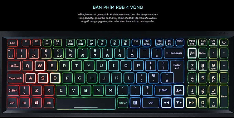 - Nitro 5 AN515 57 74NU có bàn phím full size, layout sắp xếp khá quen thuộc, tích hợp được nhiều chức năng trong cùng một phím, nút nguồn được đặt chung trên khung bàn phím, được trang trí đèn led RGB bốn vùng vô cùng thú vị, đẹp mắt, dễ dàng tùy chỉnh led, 4 phím chuyên dụng WASD và phím tắt mở Nitro Sense được viền nổi bật hơn các phim xung quanh.