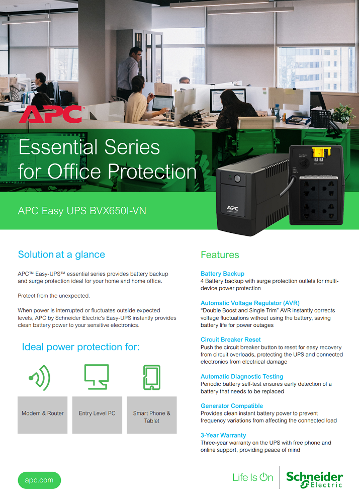 Bộ lưu điện APC easy UPS BVX650I-VN,230V (SFAPC22-002)_QABUPS sử dụng công nghệ Line interactive với tính năng tự động ổn áp (AVR) giúp bảo vệ thiết bị của bạn khi bị mất điện đột ngột hoặc quá tải dòng điện.